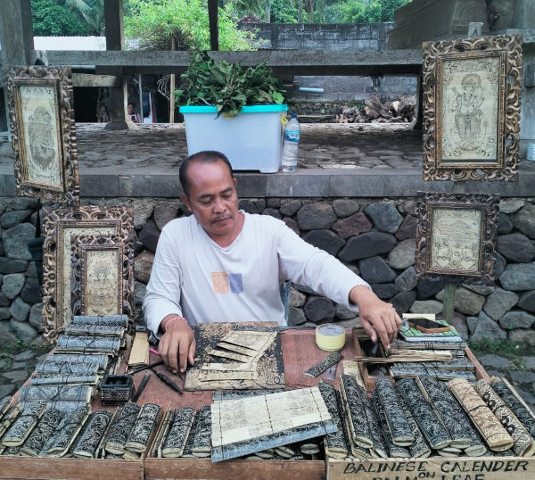 [At Tenganan village, Bali: An artist makes palm leaf paintings, similar to the palm leaf art at Raghurajpur in Orissa. Bali and Orissa had a close cultural connection due to maritime trade]