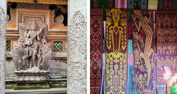 [L to R: A statue of Saraswati at a door in Bali; Traditional textile weaving at a village in Lombok island, east of Bali]