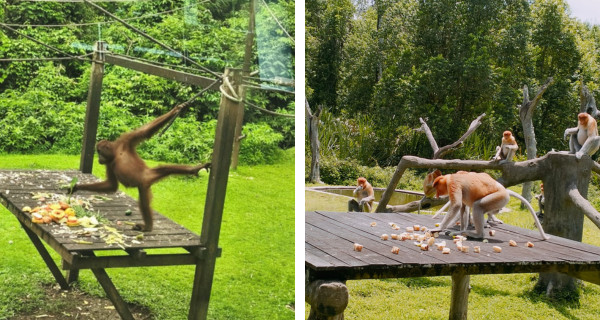 [L to R: An orangutan at its lunch; A group of Proboscis Monkey]