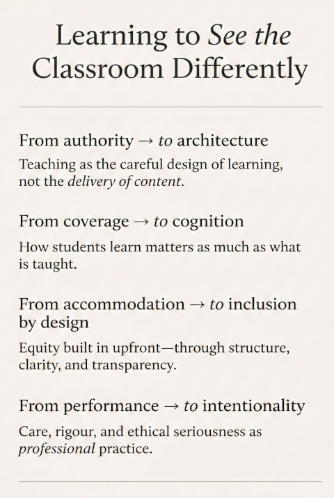 The course did not offer quick techniques or fashionable prescriptions. Instead, it quietly but insistently forced me to re-examine who I thought I was as a teacher, and what I believed actually helps students learn. It challenged long-held assumptions about rigour, authority, and design, and replaced them with something more demanding: intentionality.