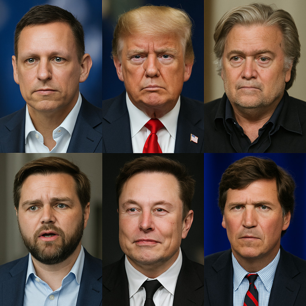 Left to right (top row): Peter Thiel, Donald Trump, Steve Bannon.