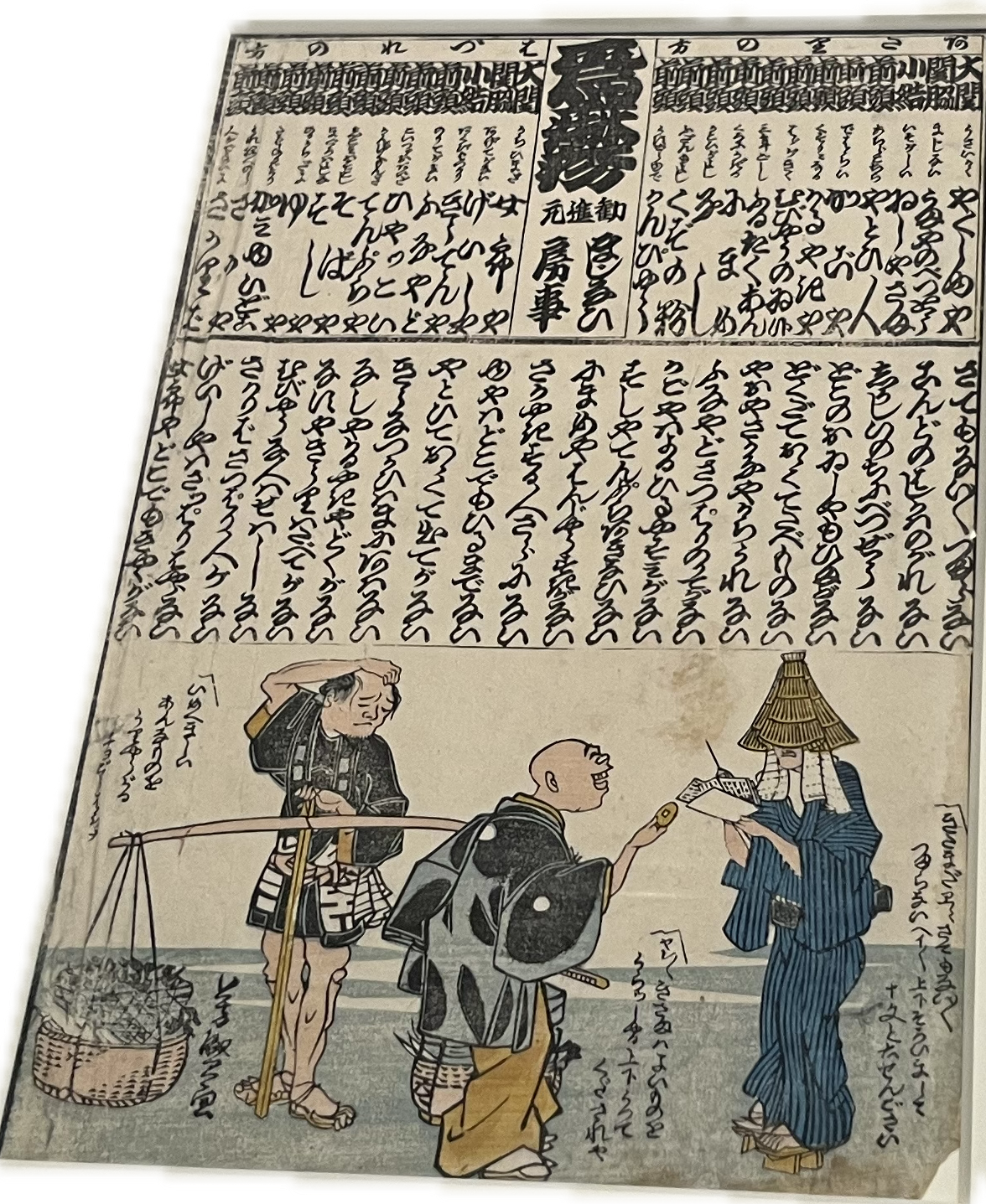 A man is being paid for a woodblock print—something like a newspaper of its time. He covers his face, not out of modesty, but because he doesn’t want to be held accountable for what’s printed. Woodblock printing, far from being state sanctioned, was published in corner shops by those driven to do it.