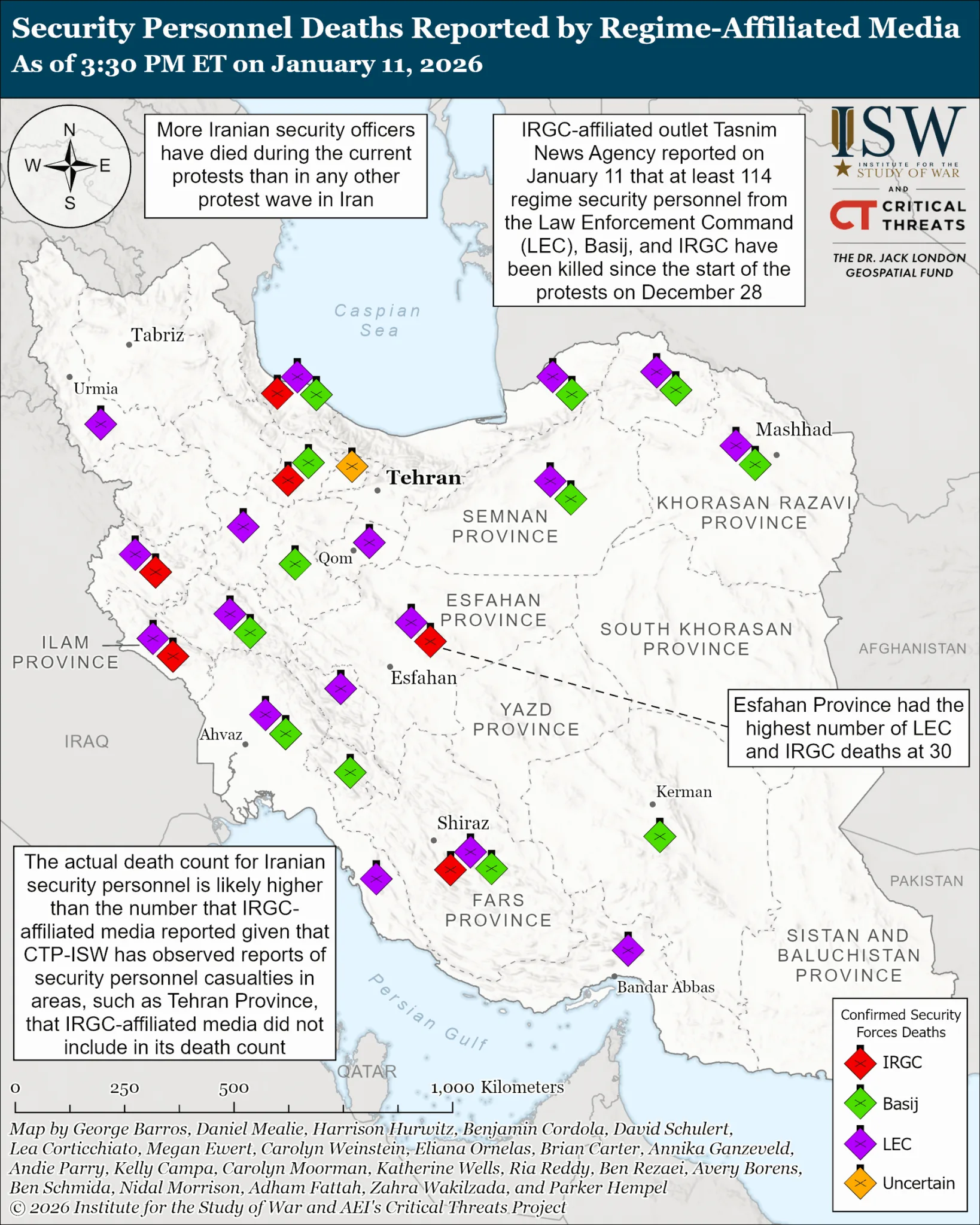 Al Jazeera reports widespread violence. The Institute for the Study of War (ISW) says unrest has spread to over 30 cities and towns nationwide. It reports that IRGC-affiliated media claimed on January 11th that at least 114 regime security personnel from the Law Enforcement Command, the Basij and the IRGC had been killed since protests began on December 28th. Reuters puts the total death toll at more than 500.