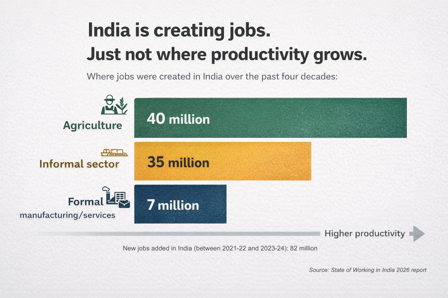 Between 2021-22 and 2023-24, India added roughly 82 million employed people. This is the figure that appears in policy speeches and media commentary as evidence of economic resilience. What the State of Working India report makes clear is that nearly 40 million of those 82 million jobs were added in agriculture. Much of this increase came from women, whose post-pandemic employment gains were concentrated overwhelmingly in rural self-employment, particularly agriculture.